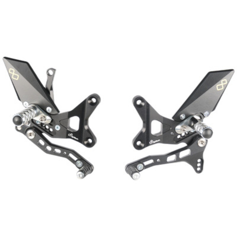 Le système de repose-pieds réglables avec repose-pieds rabattables se présente comme un élément technologique exceptionnel pour les motocyclistes. Fabriqué en aluminium aéronautique à haute résistance, il associe une construction légère de premier ordre à un design italien exclusif. Le système de repose-pieds peut être réglé à la fois vers le haut et vers l'arrière, ce qui permet au conducteur de l'adapter à ses préférences ergonomiques.