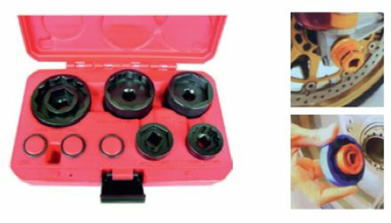 Coffret de 5 douilles spécialement conçu pour les écrous d’axes de roue ayant des caractéristiques spécifiques.