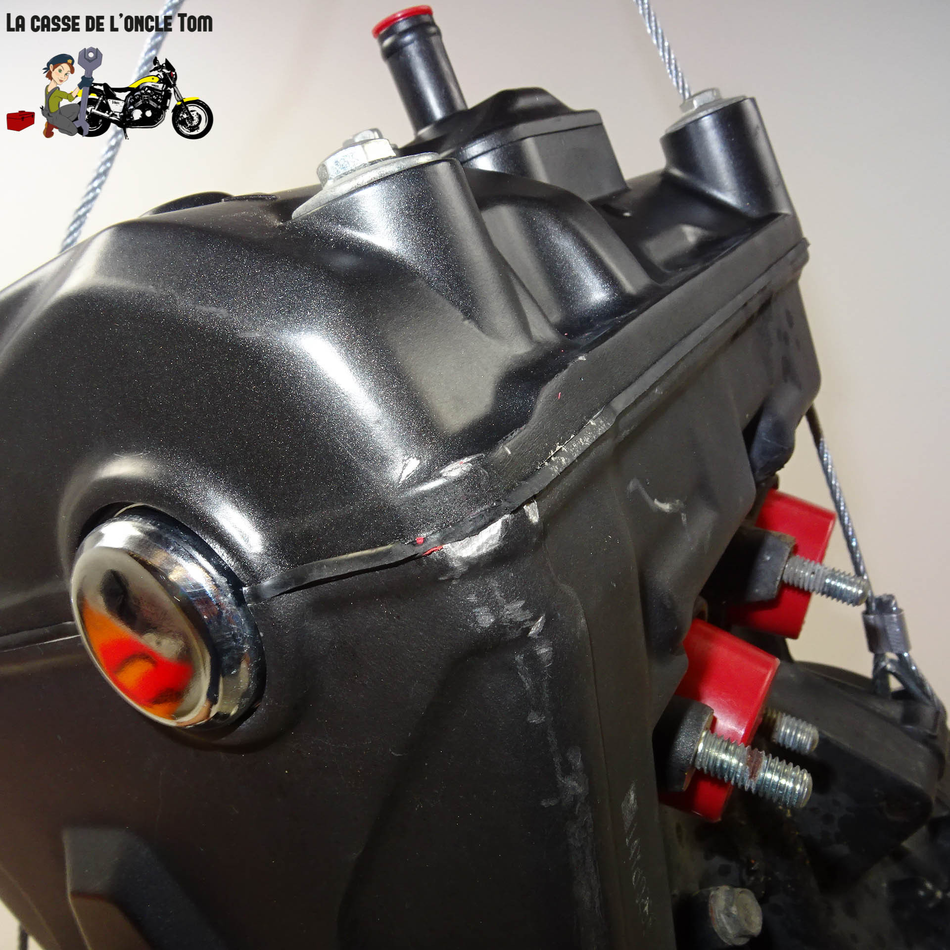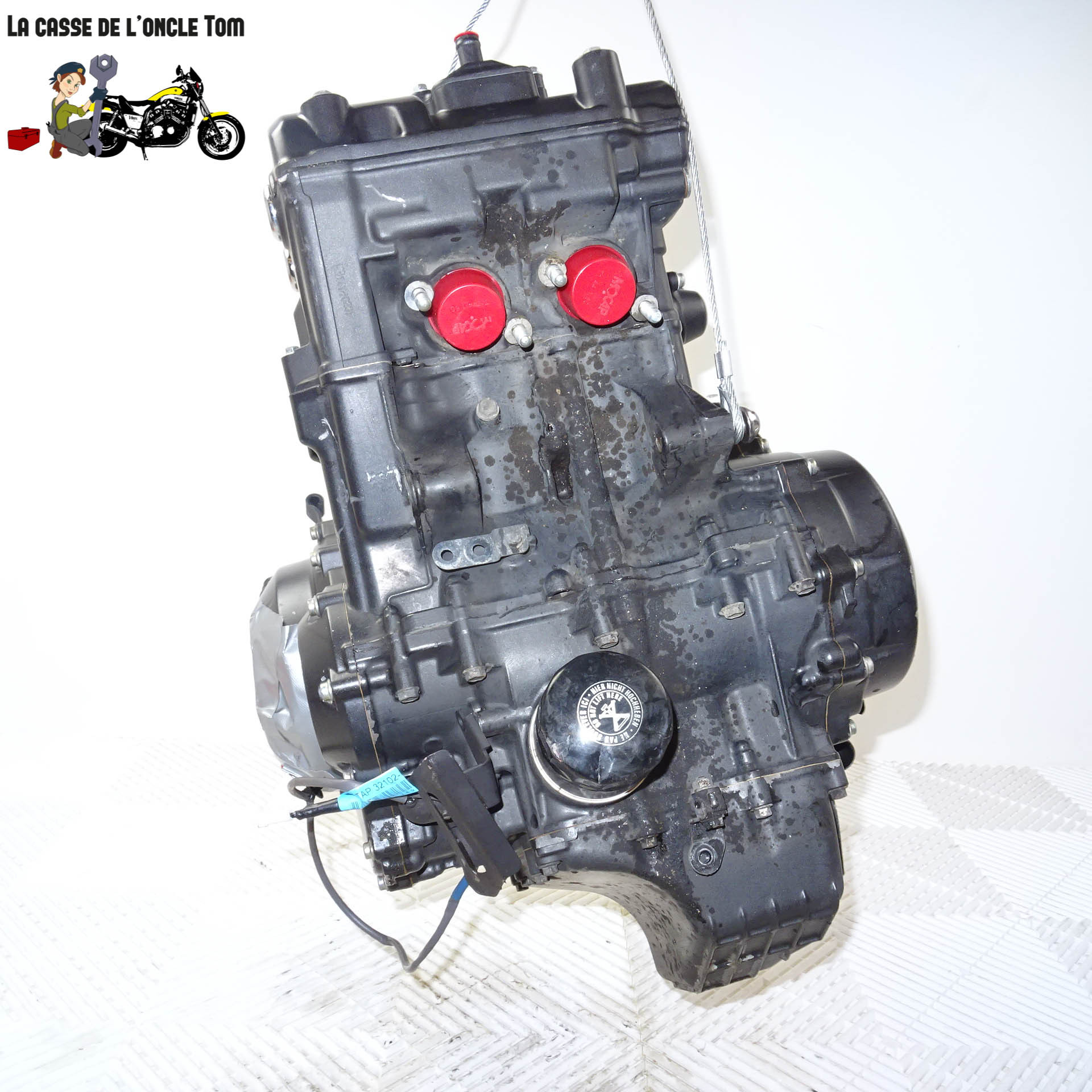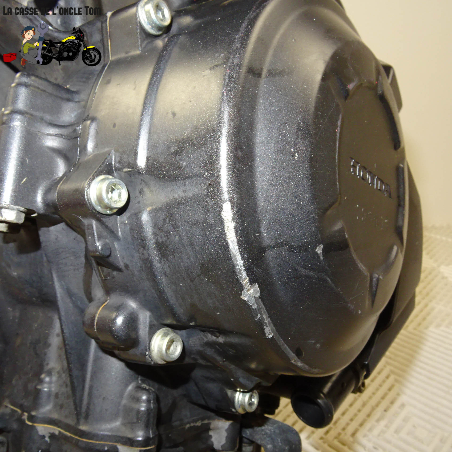 Le carter d'embrayage est endommagé, mais le moteur reste non bloqué, ce qui laisse entrevoir de belles possibilités de réparation ou de restauration. Notez que le moteur n'a pas été démarré par nos ateliers en raison de l'absence de certains composants électroniques sur la machine initiale. Cependant, il constitue une opportunité intéressante pour les bricoleurs expérimentés et les mécaniciens en quête de pièces moto Honda à prix attractif.
