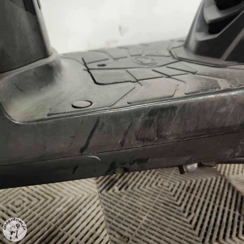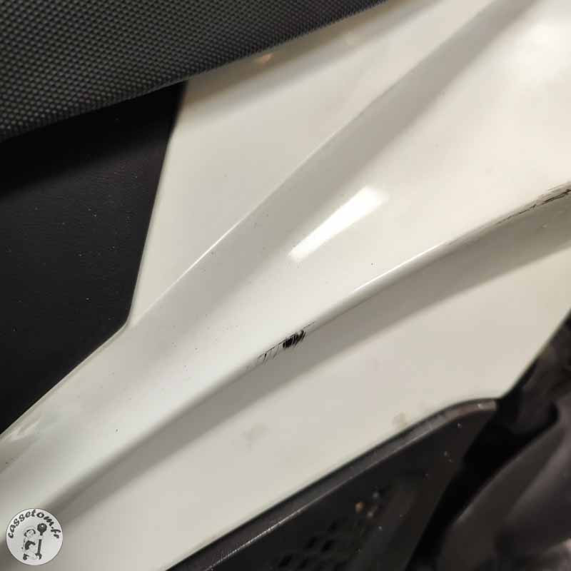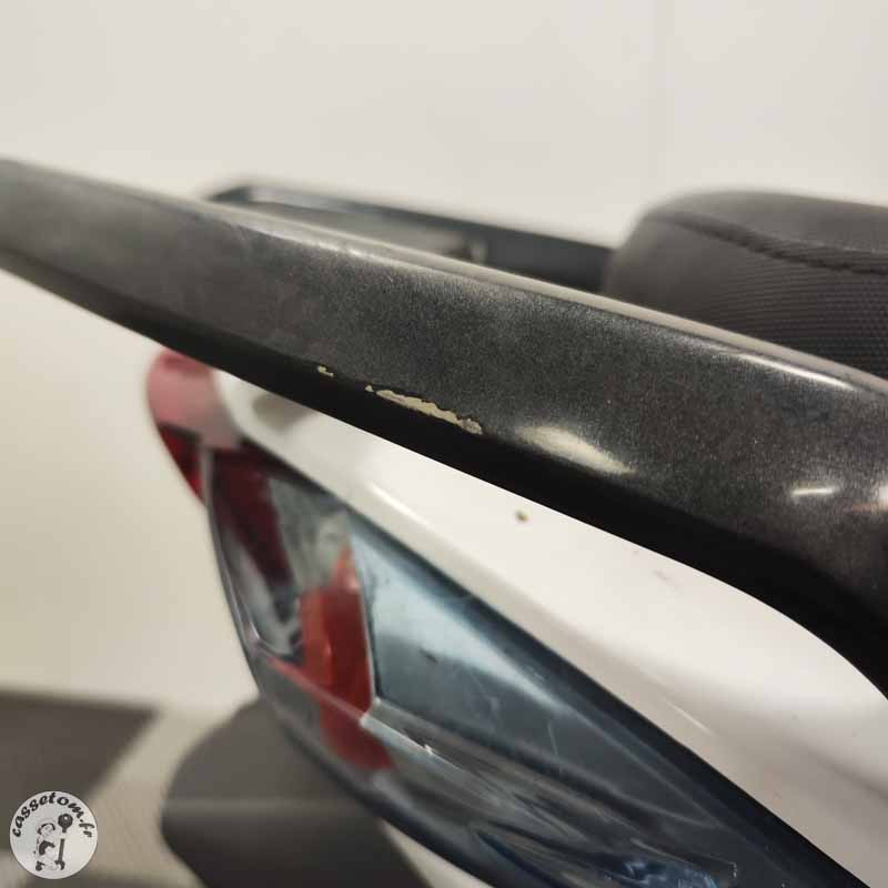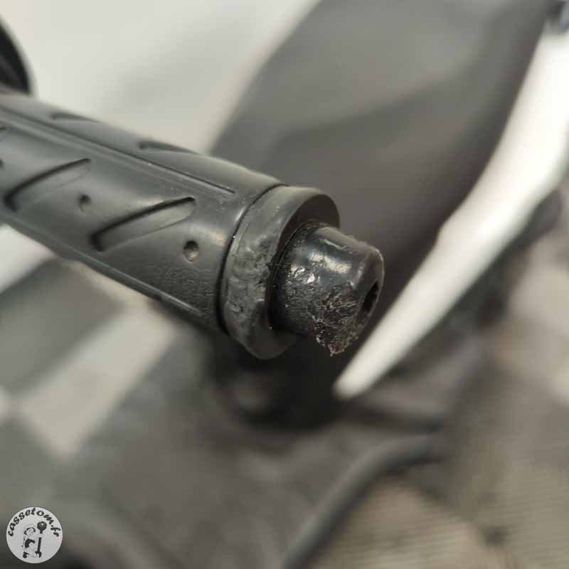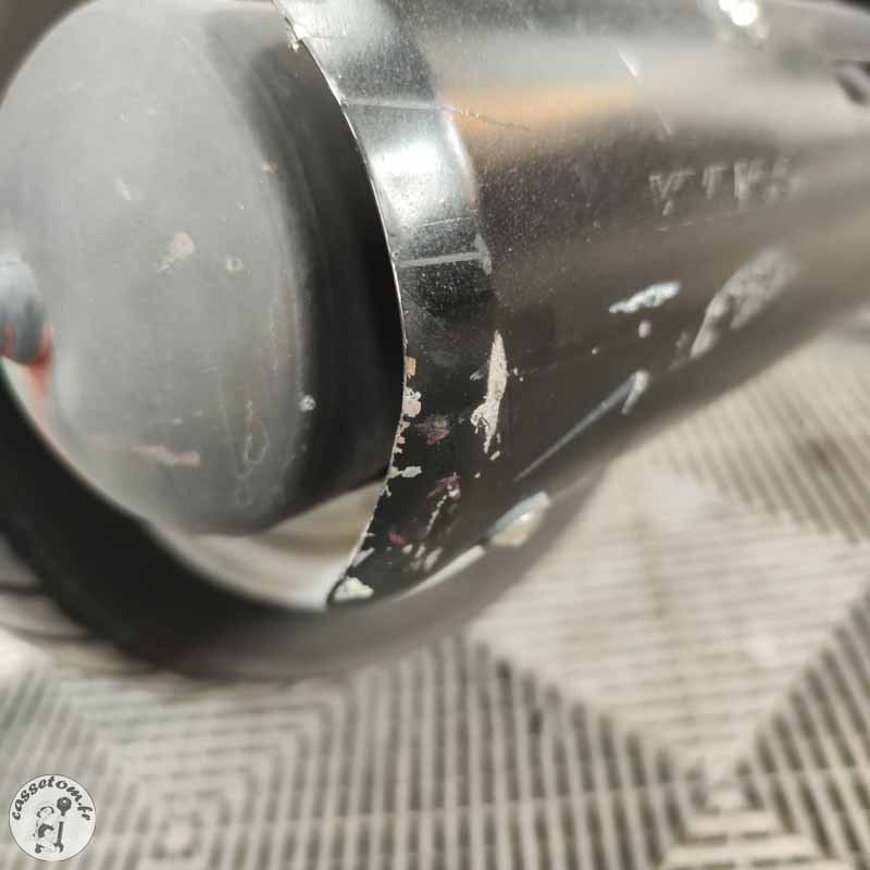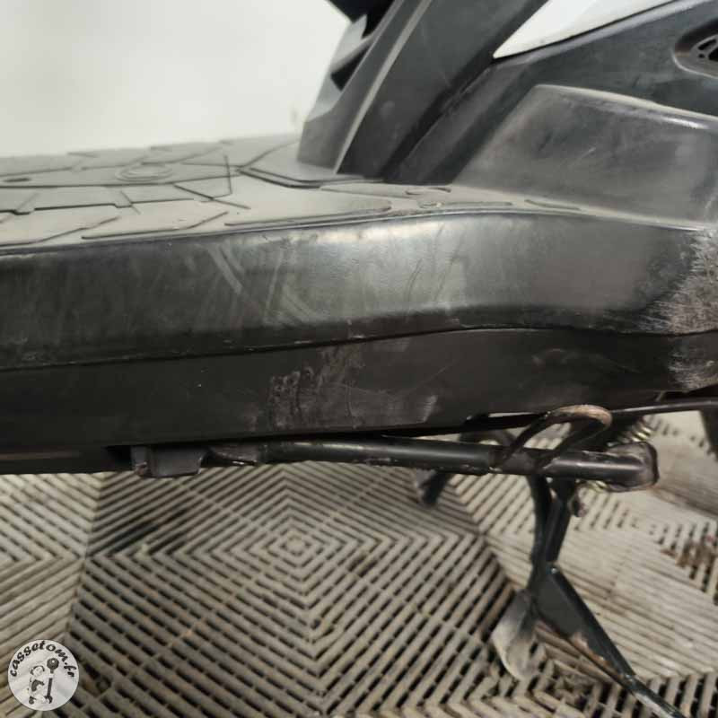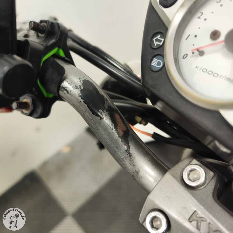 LES PROBLÈMES ✗ BUTÉES HS : butées de cadre cassées et manquantes, butées de T marquées ✗ CADRE MARQUÉ ✗ FOURCHE COMPLÈTE HS : bras droit et gauche HS ✗ Tés : supérieur et inférieur à contrôler ✗ Jante avant : à contrôler ✗ Bras oscillant : à contrôler ✗ Carénages : nombreux cassés ou râpés