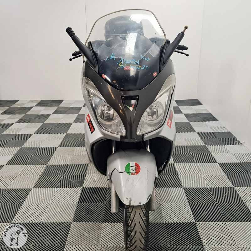 Scooter Aprilia Atlantis 125 thermique de 2005 avec 35217 km au compteur. Véhicule accidenté suite à des chocs multiples en partie avant, droite et gauche, présentant des dommages esthétiques importants sur les carénages et l'optique.
