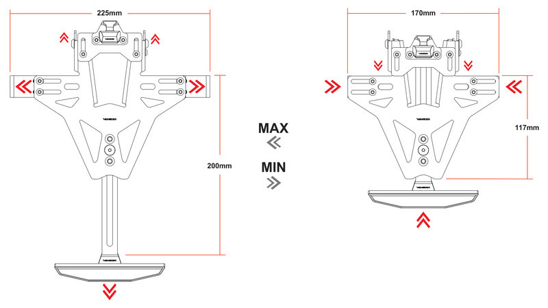 Les supports de clignotants du HIGHSIDER AKRON-RS PRO sont ajustables en largeur et conviennent donc à tous les types de clignotants accessoires. Cette option d'ajustement vous permet d'adapter la position de vos clignotants à une grande variété de plaques d'immatriculation. Pour permettre le montage des clignotants sans les déconnecter du faisceau de câblage, les trous de 8 mm sont fendus sur le côté.